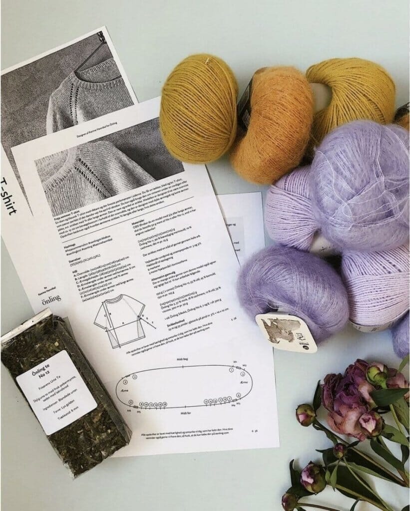 Herefter står der, at der strikkes med én tråd gennem hele arbejdet. Det betyder, at du skal strikke med én tråd. Nogle trøjer skal strikkes med flere tråde, som for eksempel kunne være med en tråd Önling No 1 og en tråd Önling No 10 som følgetråd på samme tid. Her ville der stå, at der skulle strikkes med to tråde garn gennem hele arbejdet.