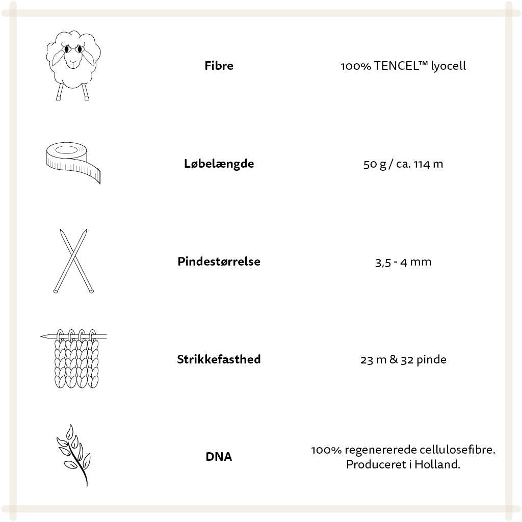 TENCEL™ fibrene i dette garn er produceret af det Østrigske firma Lenzing i miljøansvarlige produktionsprocesser i et lukket kredsløb (certificeringsnummer 11910482)