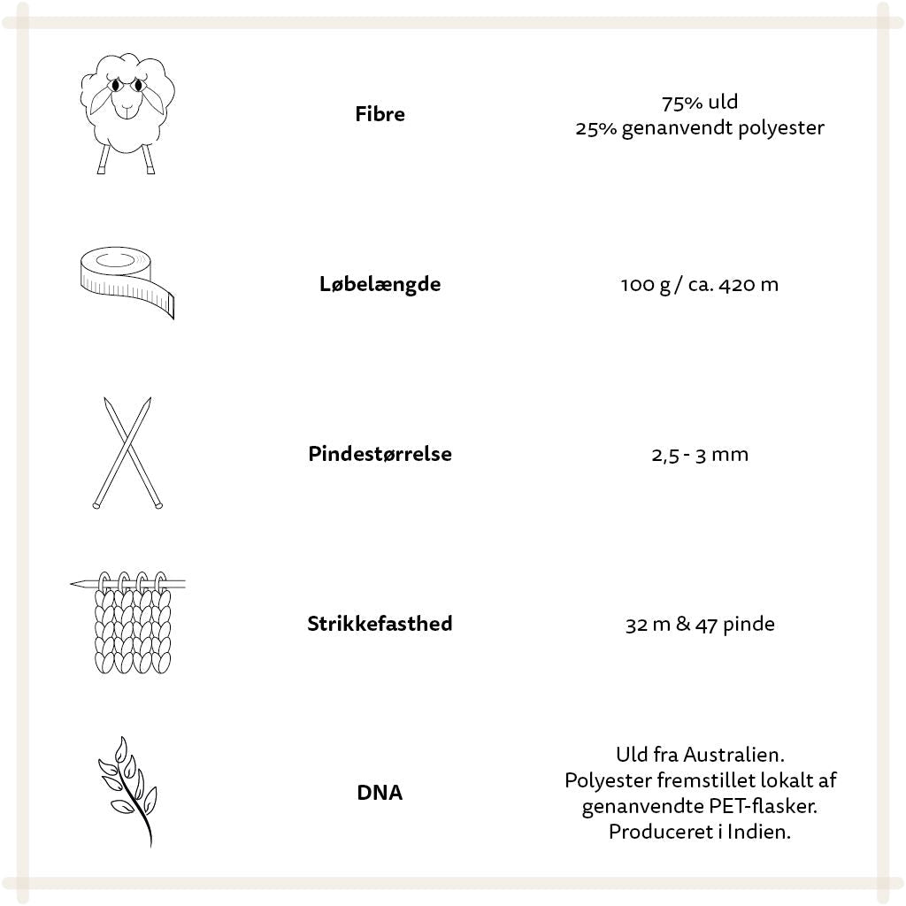 Garnets dna: Uld fra Australien og polyestertråd fremstillet lokalt af genanvendte PET-flasker. Garnet er produceret i Indien.
