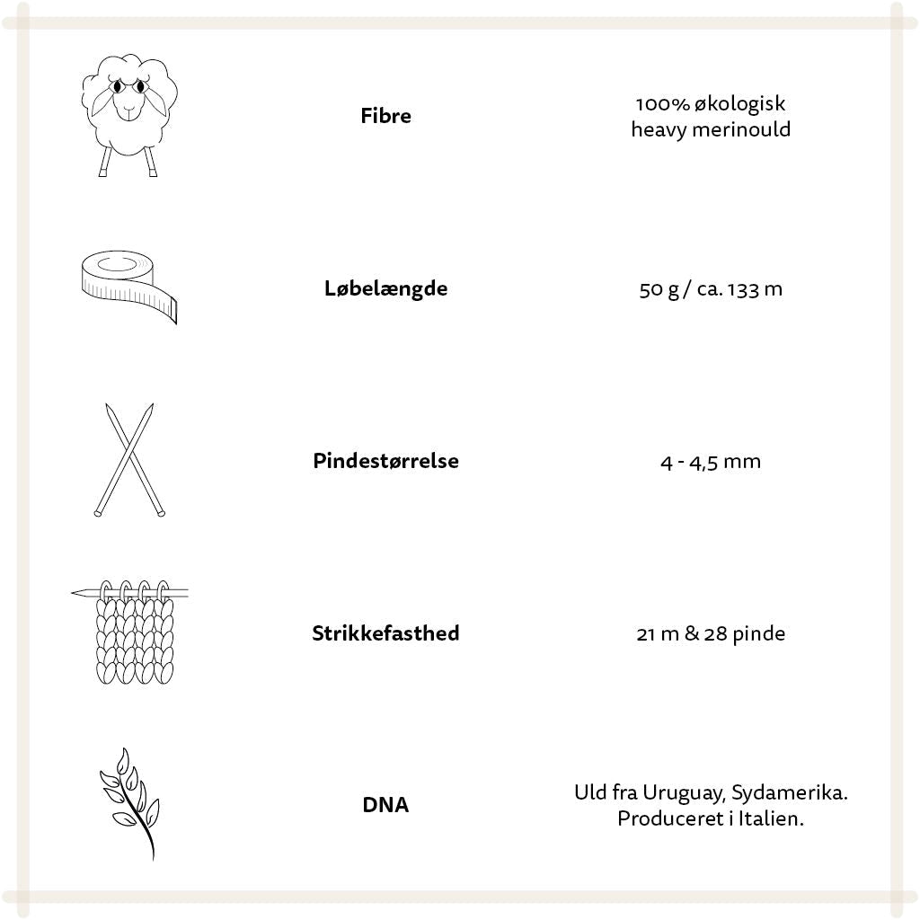 Skab noget enestående med dette økologiske merinouldgarn. Den bløde og kradsefri kvalitet er perfekt til at skabe tidløse designs, der bevarer deres skønhed år efter år. Garnet er i samme kvalitet som Önling No 4, blot kraftigere. Det er let at arbejde med og giver flotte resultater, både strikket alene eller sammen med andet garn.
