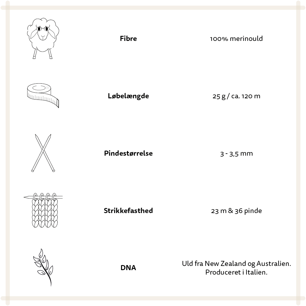 Garnet er SustainaWool-certificeret, hvilket sikrer mulesing-fri merinould fra får, der lever under ordnede og ansvarlige forhold. Ulden er desuden fuld sporbar.