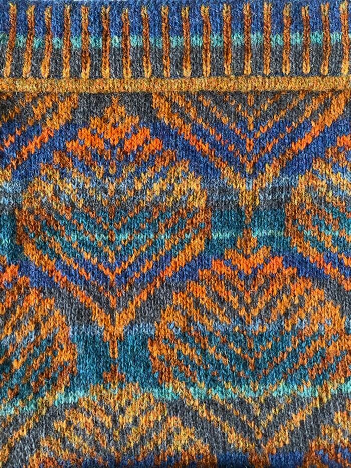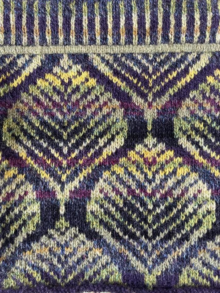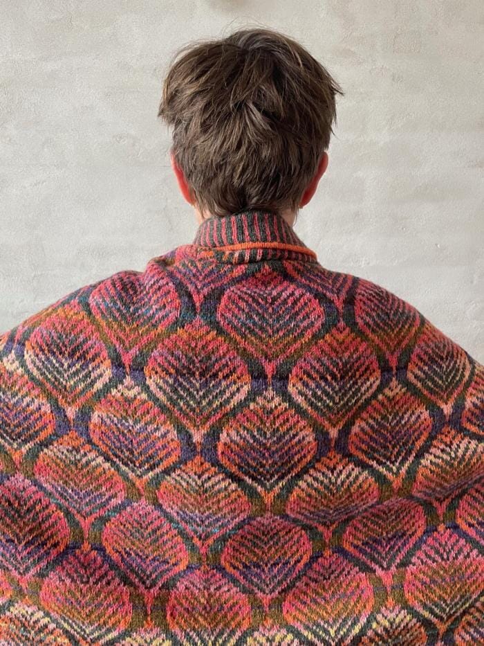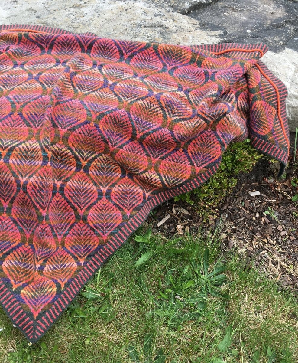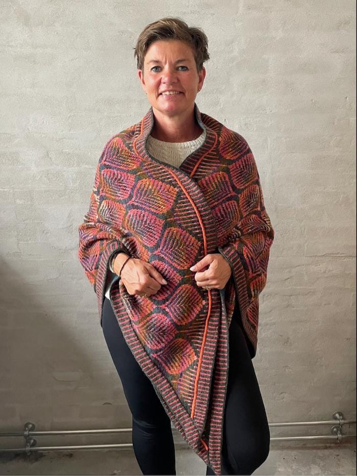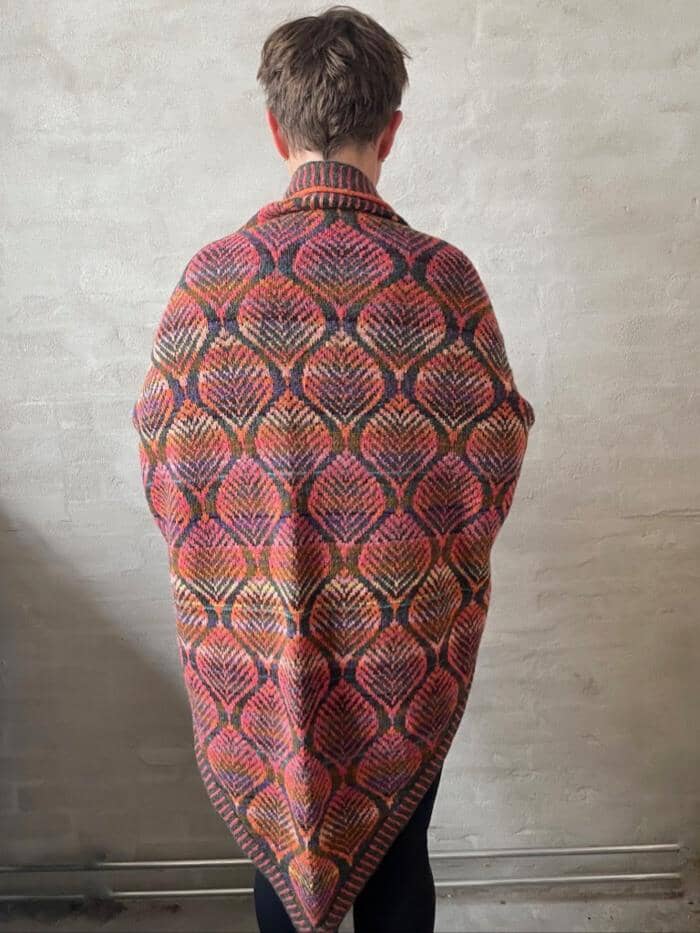 Dette store sjal er intet mindre end et stykke kunsthåndværk, designet af dygtige Ruth Sørensen. Ruth er en erfaren strikkedesigner som er usigelig dygtig til at designe mønsterstrik / Fair Isle og til at sammensætte farver.