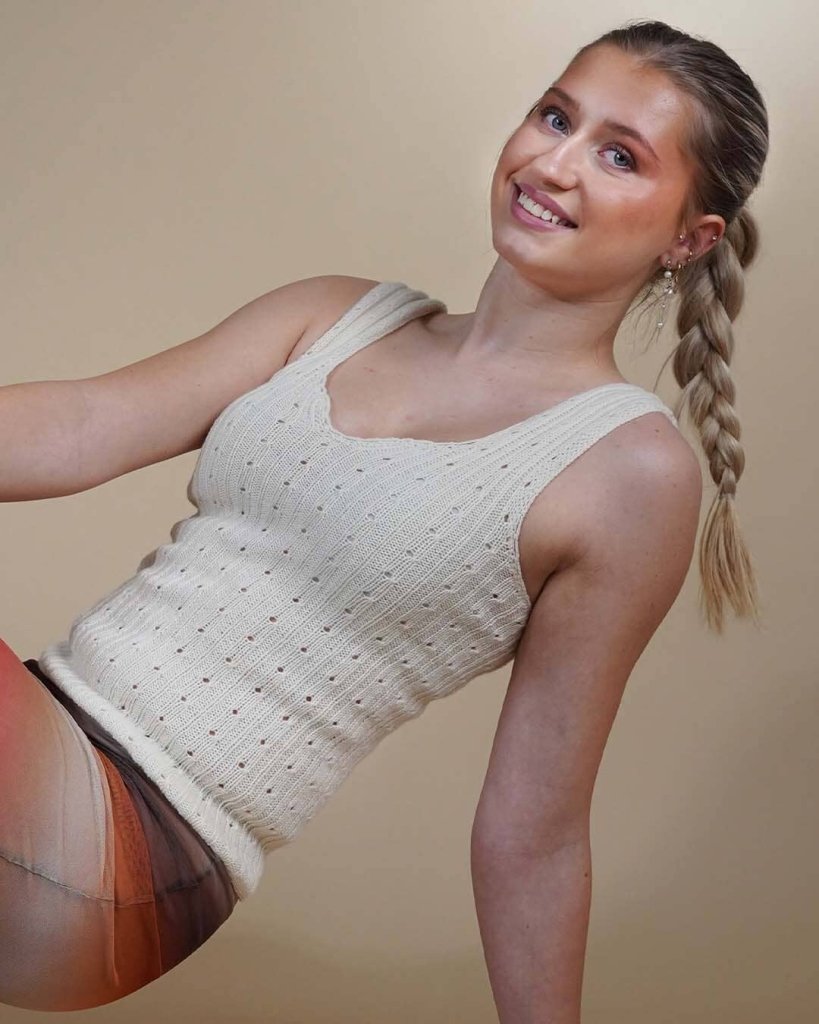 Her er en super fin skøn og ultra femimin sommertop, som leder tankerne hen på vores mormødres fineste undertrøjer med blonder på. Du kan bruge den fine sommertop hele sommeren sammen med dine fine sommernederdele eller shorts. Toppen er strikket i et fint ribmønster med indbygget hulmønster. Toppen har et negativt ease på ml 20-30 cm så pasformen er tætsiddende som en undertrøje (bemærk at ribben giver sig meget, når den tages på).