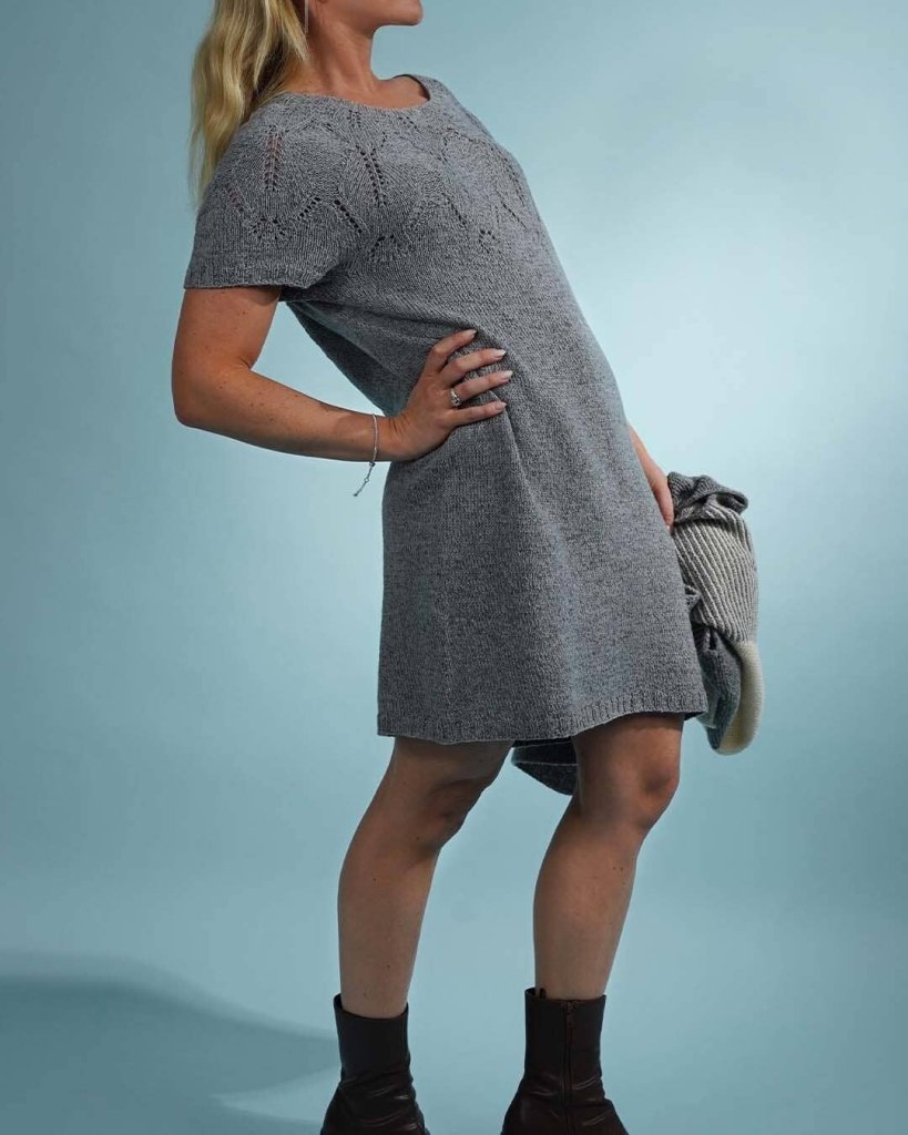 Iris er en fræk kjole, der med sit enkle hulmønster, og lækre garn er så fængende at den næsten strikker sig selv. Strikket oppefra for at sikre en god pasform, som du kan regulere undervejs, og det korte ærme kan nemt forlænges, hvis du vil tilpasse Iris til de knapt så lune sommeraftener. Iris kjolen er en forlængelse af Iris sommertop, som har det samme smukke hulmønster. Den er strikket i vores Hverdagskit, Önling No 12 og Önling No 13, der tilsammen giver den skønneste blanding af uld, bomuld og cashmere.