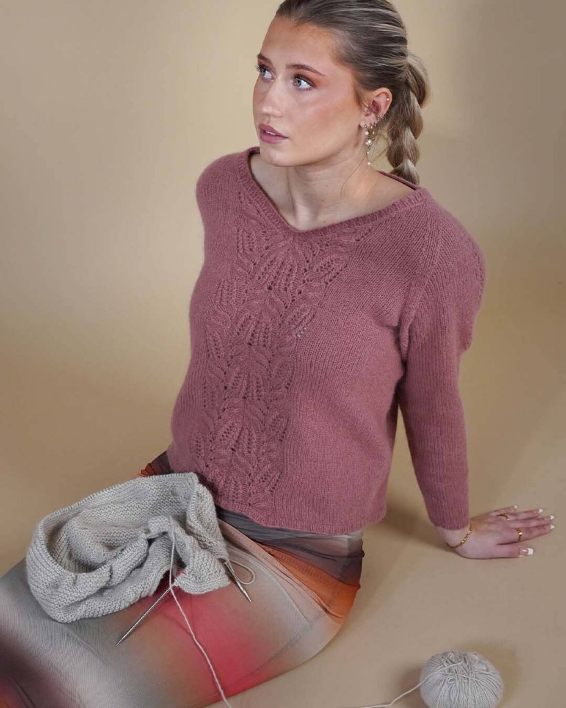 Limoncello sweater har et smukt, feminint mønster på både ryg og forstykke og fine kanter i silk mohair. Navnet stammer fra den italienske citronlikør, som er citrongul. Limone betyder citron på italiensk, men den kan naturligvis strikkes i alle farver og passer perfekt til et par jeans.