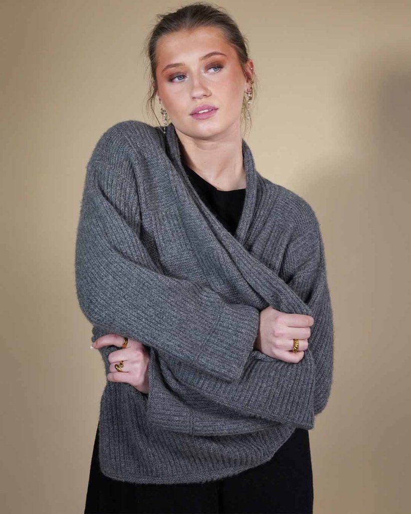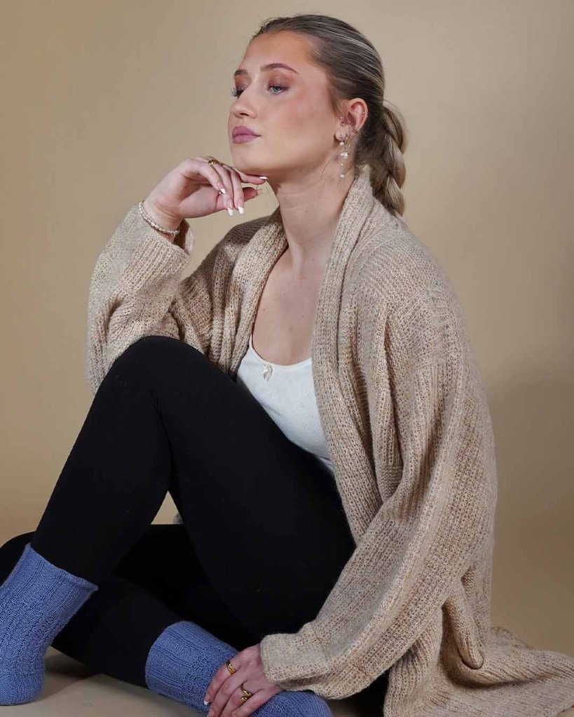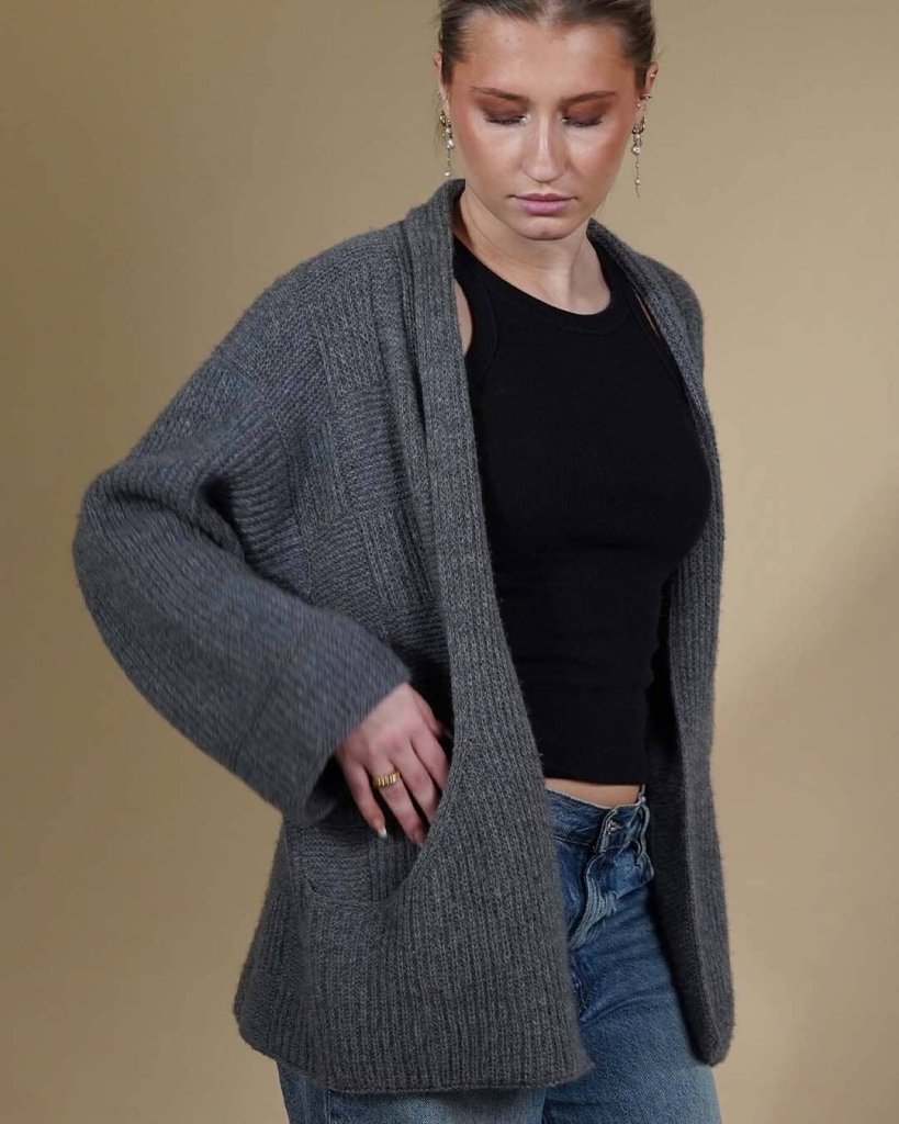Smukt konstrueret lang cardigan i halvpatent med lommer og krave / revers strikket sammen på den mest finurlige og interessante måde. Den er smuk både som ensfarvet og flerfarvet, hvor du kan lege med farver og detaljer på ærmer, opslag og krave.