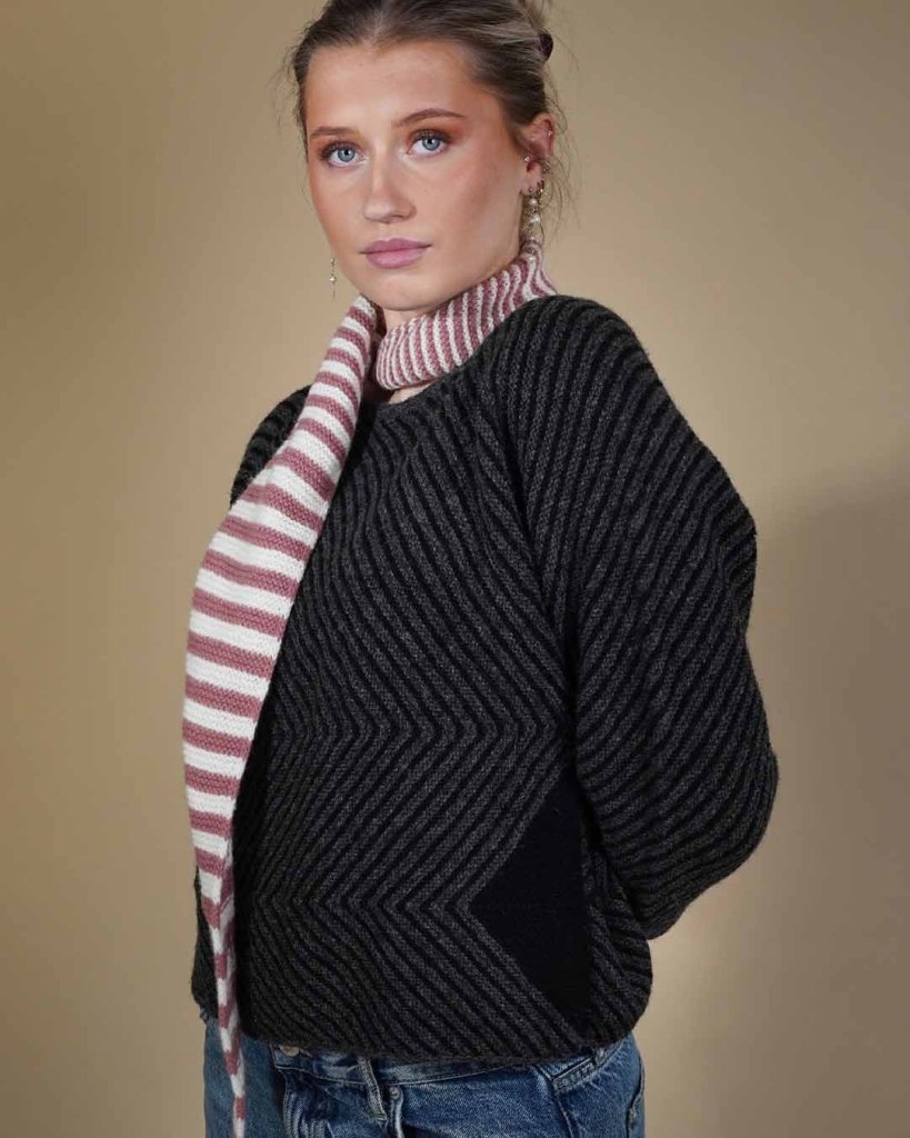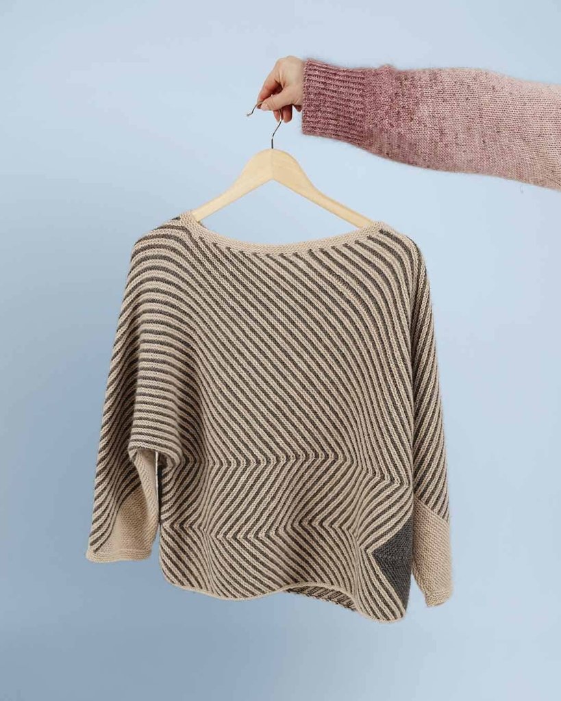 Studio er virkelig en af Hanne Falkenbergs klassiskere. Med sit grafiske mønster er den iøjenfaldende og en stor strikkeoplevelse. Sweateren er retstrikket med 3/4 lange ærmer og diagonale striber. Sweateren er lavet i et kort snit, og den er både smuk udenpå en kjole og til et par bukser.