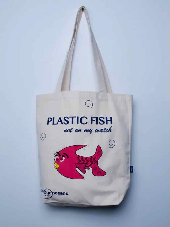 Kraftig totebag i økologisk canvas med printet 'Plastic fish, not on my watch'