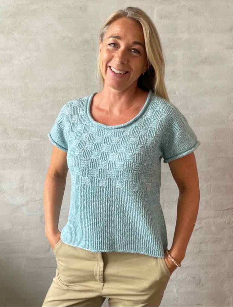 Modellen strikkes på tværs fra sidesøm/ærmekant til sidesøm/ærmekant, alt ud i et stykke. Kun halskanten strikkes til slut.