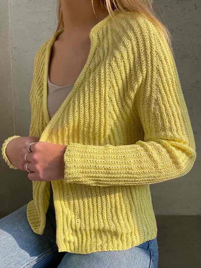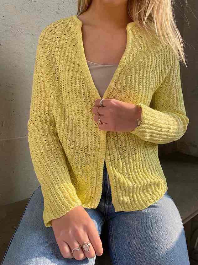 Let, sommerlig cardigan med lange ærmer, strikket i bomuld / hørgarn fra Hanne Falkenberg. Modellen strikkes frem og tilbage på fra halsen og ned, alt ud i et stykke, kun en søm langs ærmernes inderside.