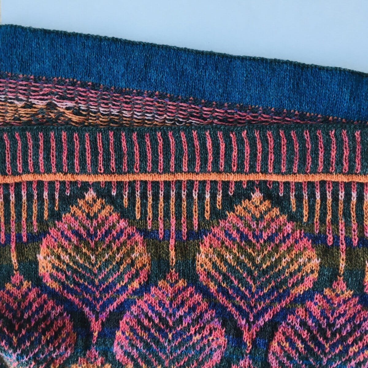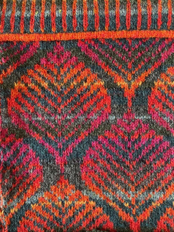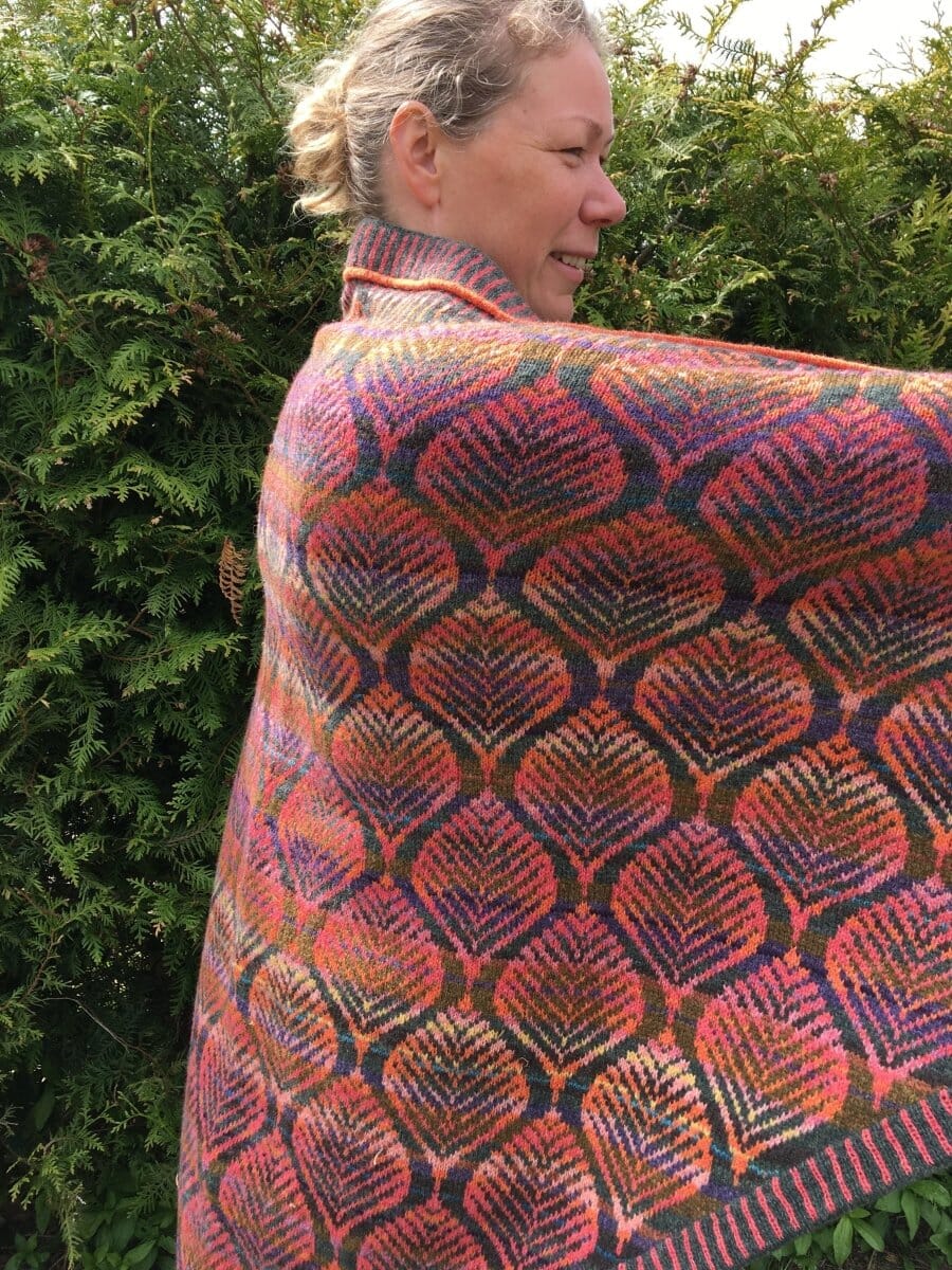 Dette store sjal er intet mindre end et stykke kunsthåndværk, designet af dygtige Ruth Sørensen. Ruth er en erfaren strikkedesigner som er usigelig dygtig til at designe mønsterstrik / Fair Isle og til at sammensætte farver.