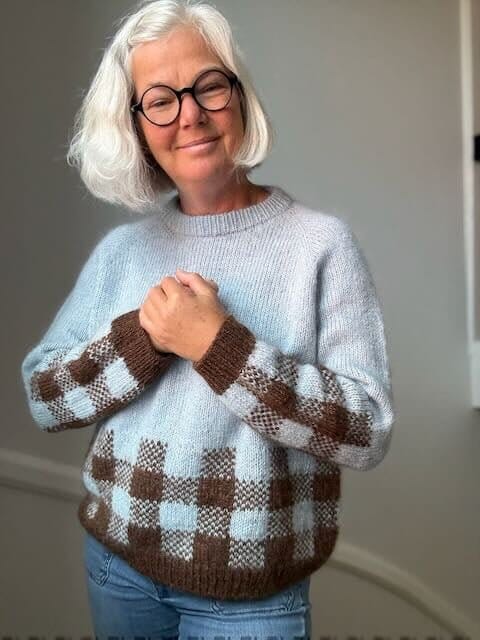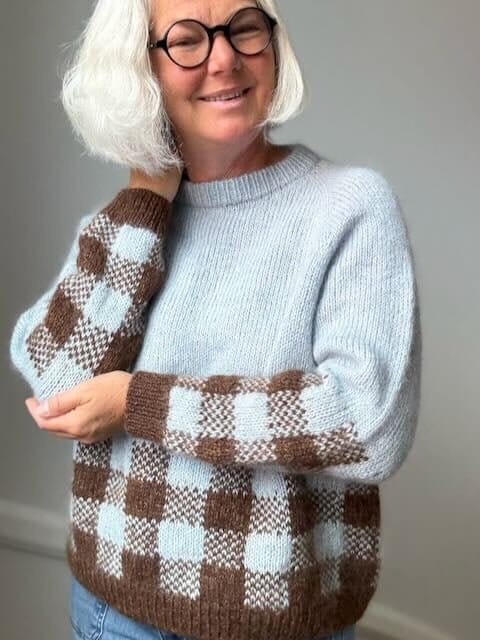 Picnic Sweater er en raglansweater med et ternet mønster nederst på krop og ærmer. Den er designet med en klassisk pasform med cirka 15 cm positive ease.