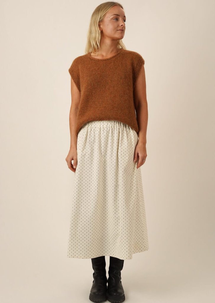 Vesten strikkes nedefra og op. Der strikkes rundt op til ærmegabet, hvorfra arbejdet deles og for- og bagstykke strikkes færdige hver for sig.