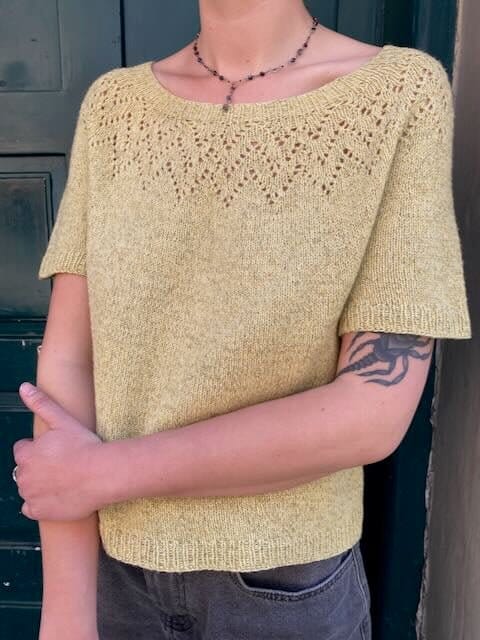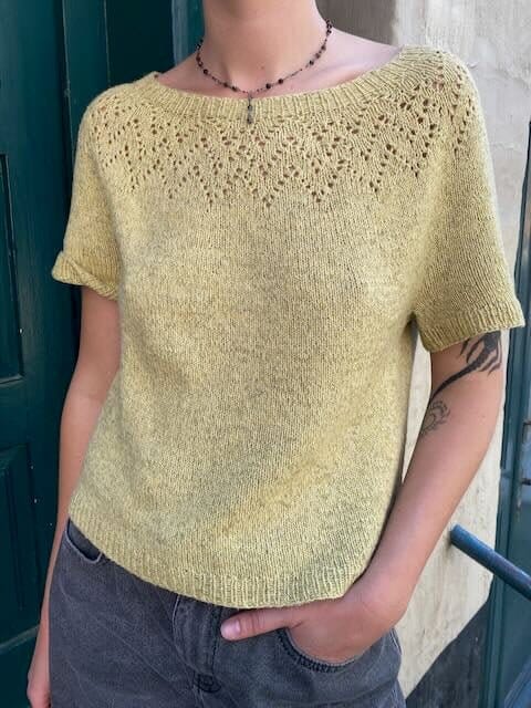 En let og blød sommertop, der med sit enkle hulmønster, er feminin, klassisk og enkel på én gang. Jeg vil tage den på til mine fine sommernederdele eller ¾ bukser og mine yndlings sandaler. Modellen er kort og en anelse oversize, dvs. ca. 5-10 cm bevægelsesrum (mere end det du måler i overvidde) og med almindelige ærmegab. Halsen er vid, så vi kan vise vores fine sommerbrune hud frem. Opskriften beskriver også, hvordan du strikker ¾ ærmer.