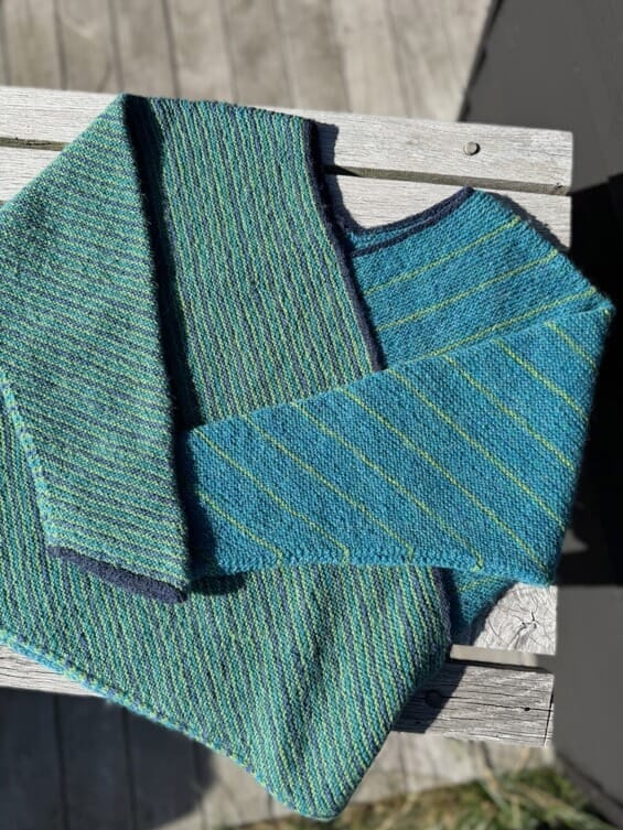 Fin sweater med skrå striber og spændende konstruktion. Trøjen strikkes frem og tilbage i to ens dele, kun striberne er forskellige. Stykkerne sys sammen med en søm der skjules bag den diagonale rouleaukant. Der er ingen sidesømme, kun en søm under ærmet.