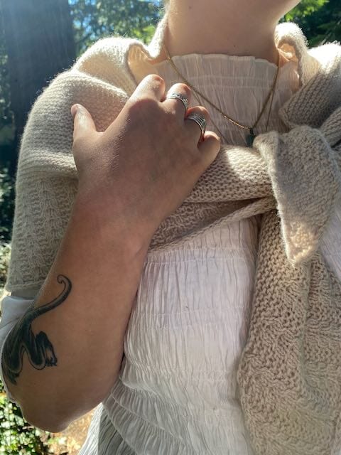 Sjalet strikkes fra midt bag i nakken og ud og starter med en stump i-cord, som fortsætter med små fine snoninger langs kanterne og med dobbeltsnoninger ned midt i tørklædet, og slutter med en bred kant af dobbeltsnoninger.
