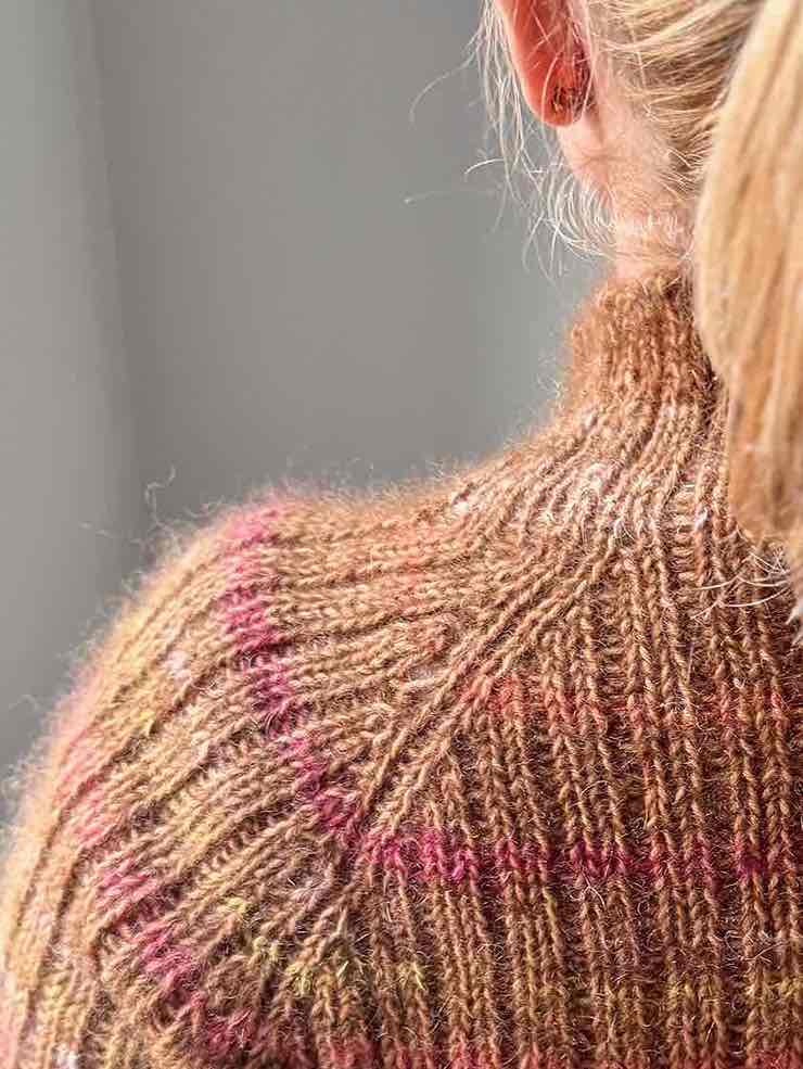 Sweateren strikkes rundt oppefra og ned. Der slåes op med italiensk opslagning i halskanten, ribmønster etableres og der strikkes vendepinde frem og tilbage over nakke, ærmer og forstykke for at skabe en højere nakke, hvilket giver en bedre pasform. Der strikkes udtagninger ved raglan på hele bærestykket, og undervejs skiftes der størrelse på pinden der strikkes med for at skabe yderligere effekt og pasform. Krop og ærmer deles og strikkes færdig hver for sig. Ærmerne strikkes i ønsket længde. Både krop og ærmer lukkes af med italiensk aflukning.