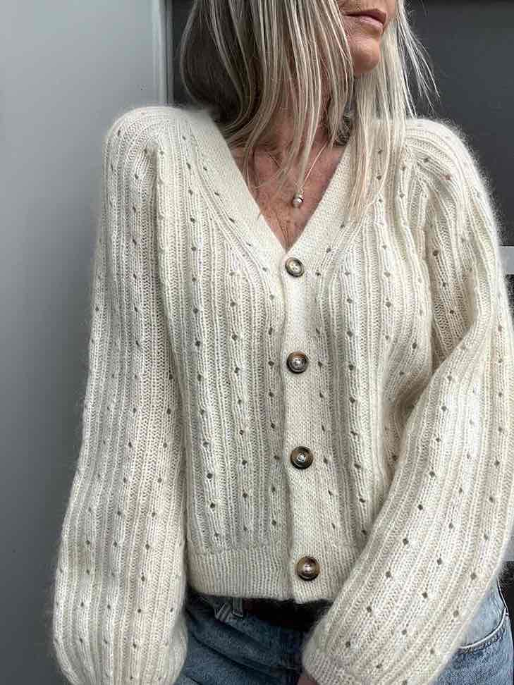 Rikke Cardigan No 1 er det sjette design i Rikke-serien – en klassisk og feminin cardigan med smuk V-udskæring og enkle, dobbeltstrikkede kanter, der giver et raffineret og eksklusivt udtryk. Cardiganen strikkes med to tråde garn – én tråd merinould (Önling No 2 eller Önling No 4) og én tråd silk mohair (Önling No 10) – som tilsammen skaber en blød, smuk og luksuriøs struktur.