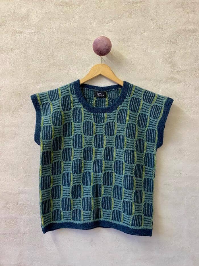 Saga kan bruges som vest eller bluse med et lille ærme strikket. Det smukke mønster fremkommer med vævestrik, dvs. du strikker kun med én farve ad gangen.