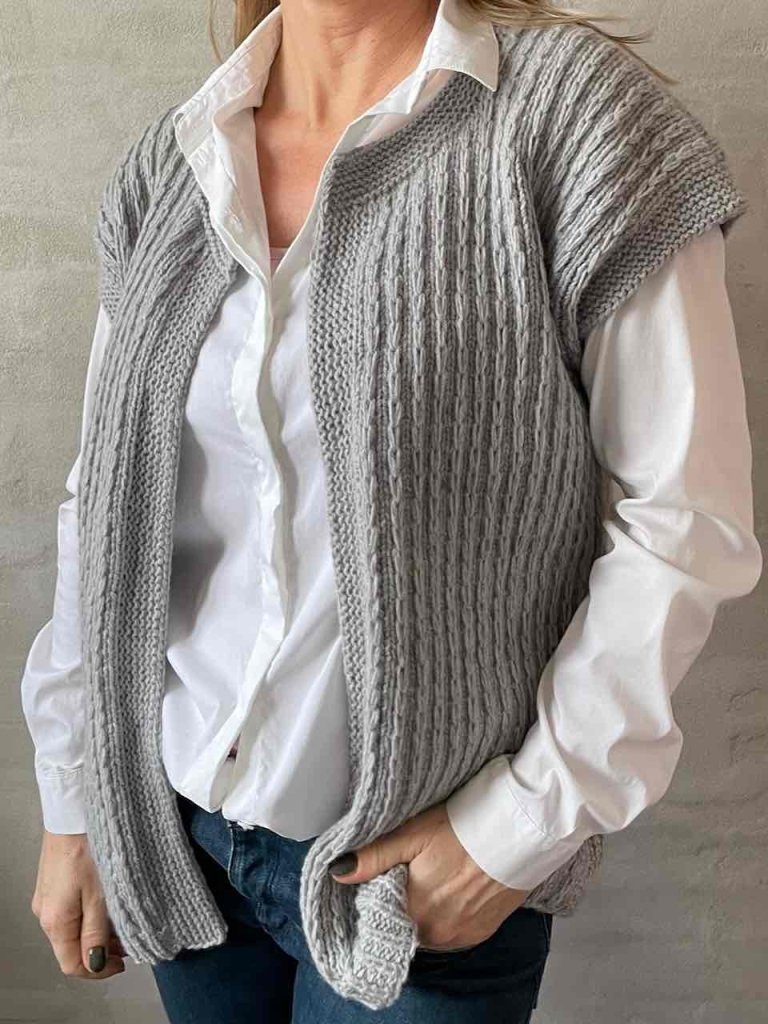 Vesten strikkes frem og tilbage, i et mønster med løftede masker. Vi anbefaler at strikke på rundpind, på grund af vægten. Hele arb strikkes med dobbelt garn.