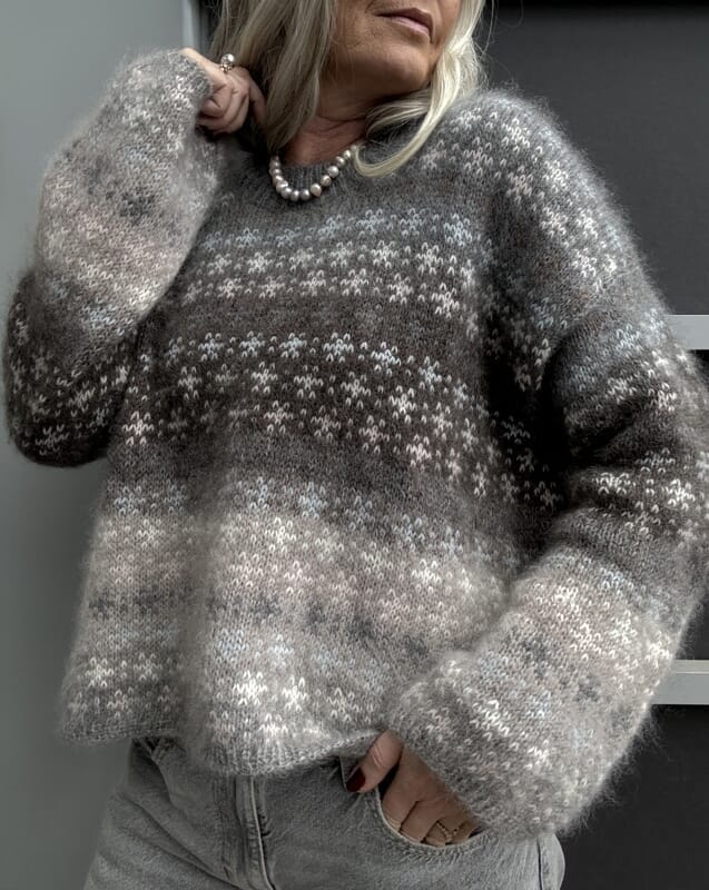 I denne version strikkes bundfarven med tre tråde silk mohair (Önling No 10) holdt sammen gennem hele arbejdet. Bundfarven strikkes som en fade, hvor du skifter en af de tre tråde ud ad gangen, så farverne glider naturligt over i hinanden uden bratte skift. Mønsteret strikkes med en tråd gennem hele arbejdet i enten Önling No 1 eller Önling No 3, hvilket giver en fin kontrast til den luftige mohair bund og fremhæver mønsteret på en elegant måde.